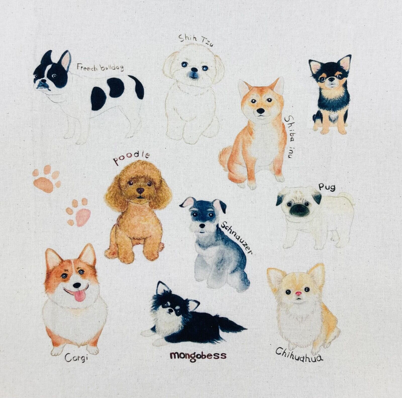 ◎描かれているワンちゃんは、チワワが3匹、シーズー、フレブル、コーギー、トイプー、シュナウザー、パグ、柴犬です。