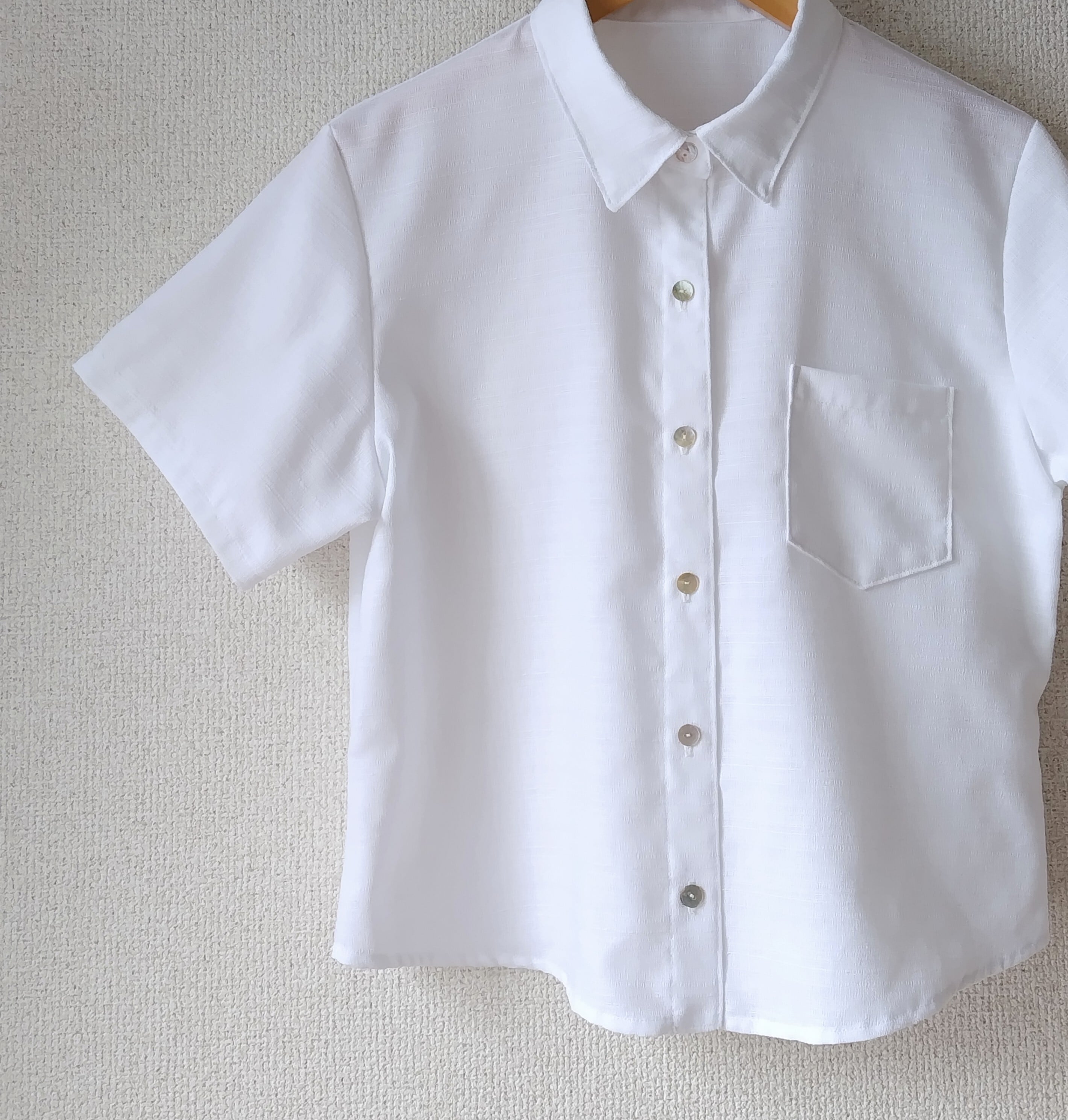 ◎肩落ちのゆったりとしたシャツが流行している昨今ですが、あえて制服のようなシンプルなシャツを作ってみました。
