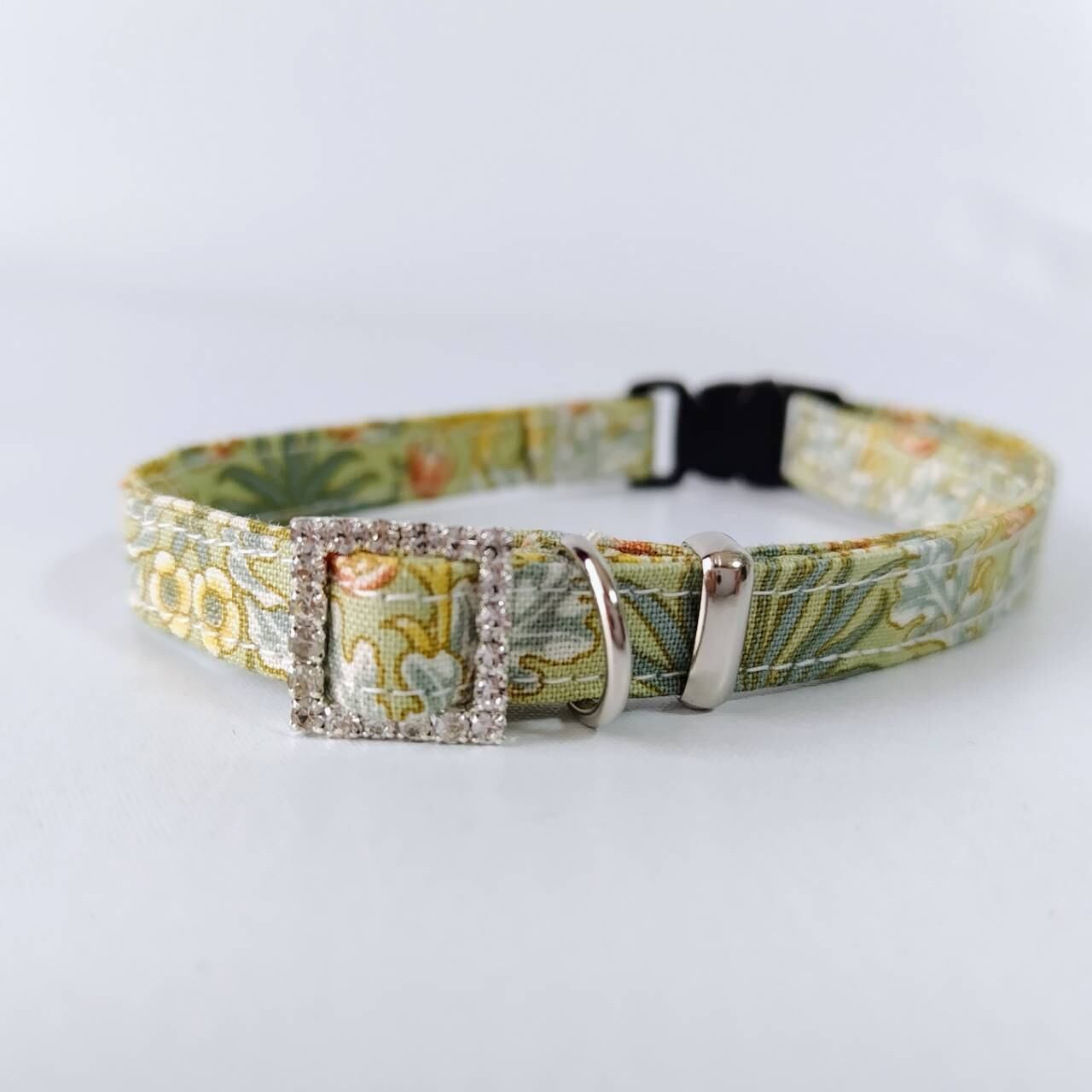 この首輪はウィリアムモリスデザインのモダファブリックス製の生地を使用しましたので、華やかでオシャレな雰囲気に仕上がりました。