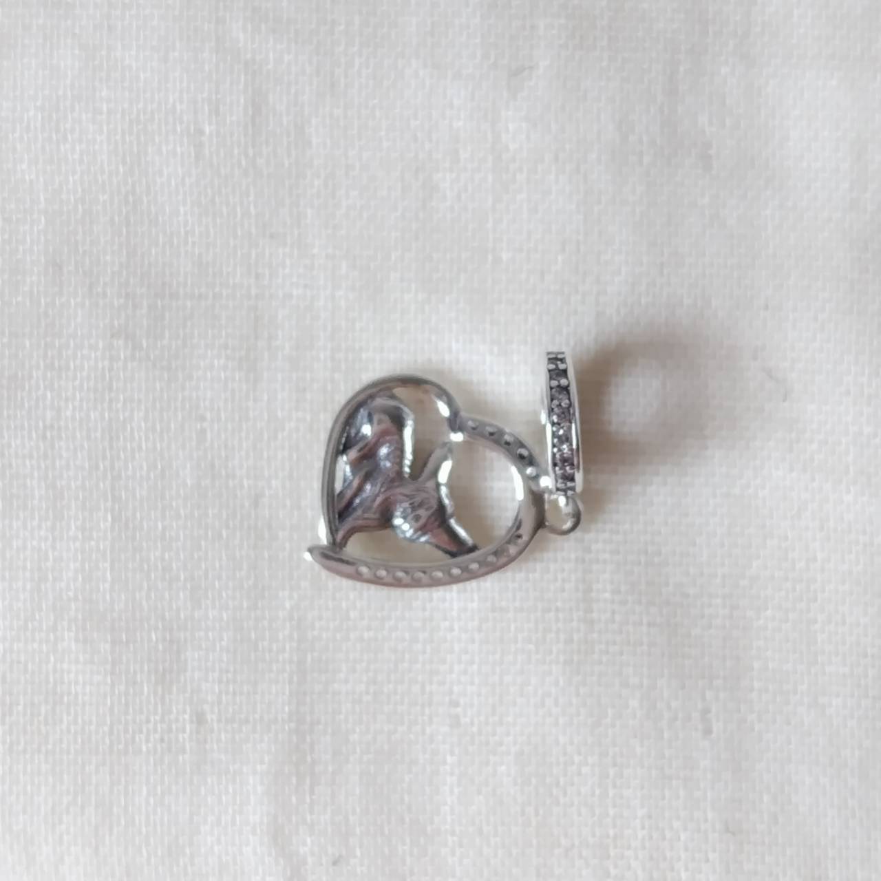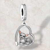 スターリングシルバーとキュービックジルコニアがキラキラと輝くハート型と、寝そべった笑顔のチワワが相まって、とても可愛いらしいデザインです。